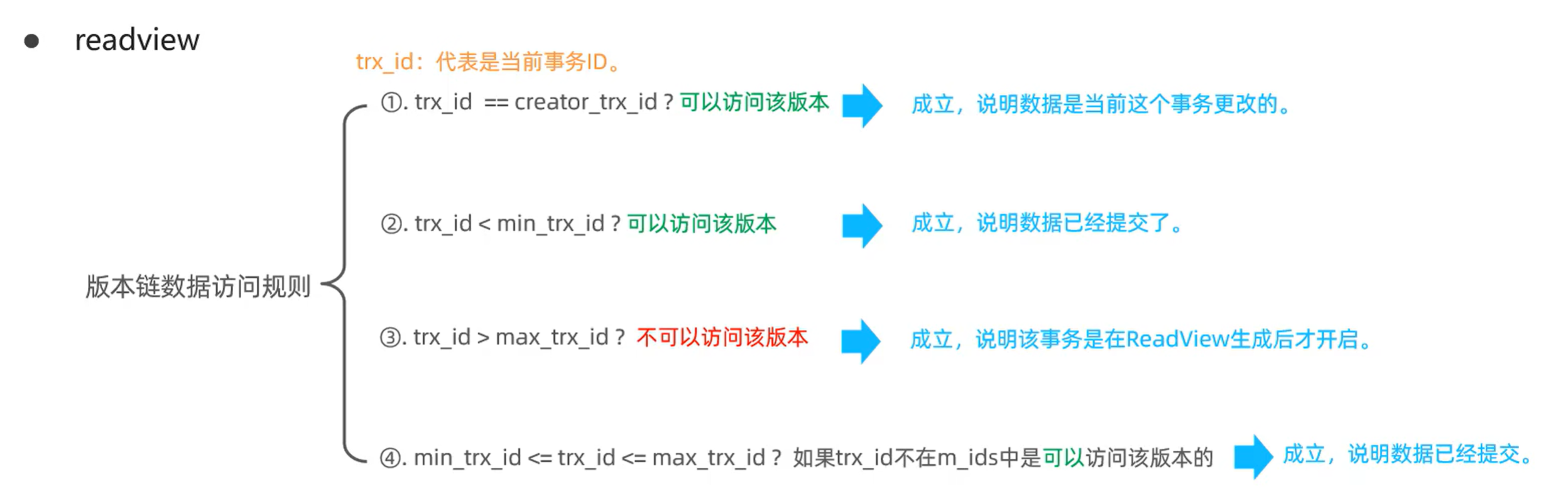 对于版本链中的某个版本,假设其对应的事务ID为 trx_id,判断规则如下:
