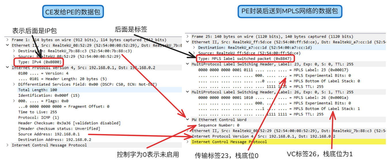 UP pri ac Gi3.20:20(Eth VLAN) UP mpls 1.1.1.13:20 UP通过抓包可以看到在MPLS网络,外层的S-VLAN被剥离了,内层的C-VLAN被留了下来。