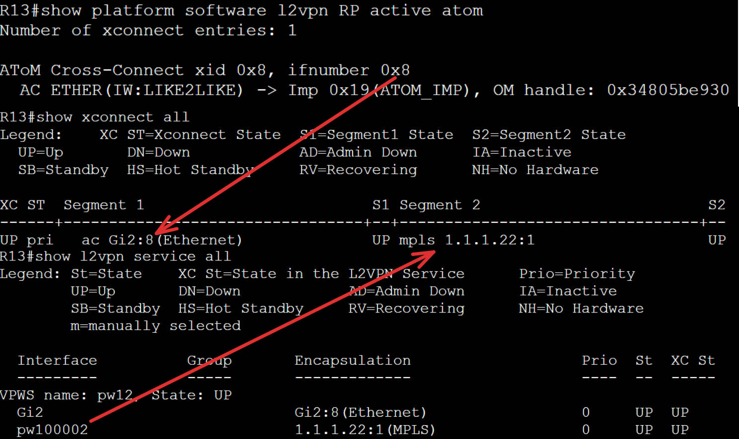 UP pri ac Gi3:9(Ethernet) UP mpls 1.1.1.13:1 UP