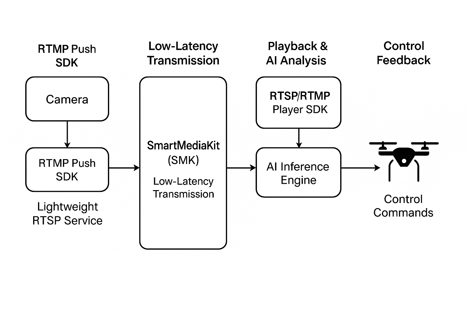 “美丽中国”的技术内涵正在延伸至低空经济、生态治理和城市感知。无人机、eVTOL、应急救援、空域管控等场景,需要实时、高可靠的视频通信体系作为信息流的中枢。 SmartMediaKit 通过 RTSP 推流 + GB28181 接入构建底层管道,结合 AI Adapter 模块完成目标检测、航迹识别与行为分析,再利用 HTTP-FLV/WS-FLV Server 轻量级回传,实现“感知—决策—调度”的闭环。 在这类新场景中,视频不再只是“画面”,而是一种结构化数据流,一种实时的感知语言。
