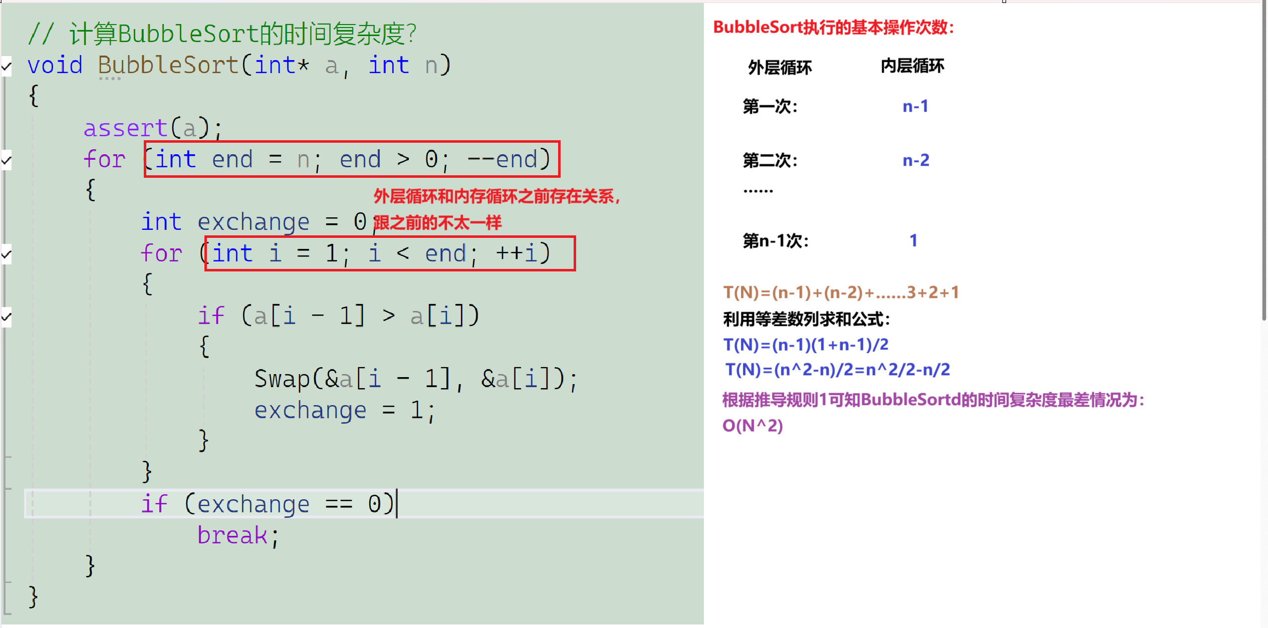 // 计算BubbleSort的时间复杂度?--O(N^2)