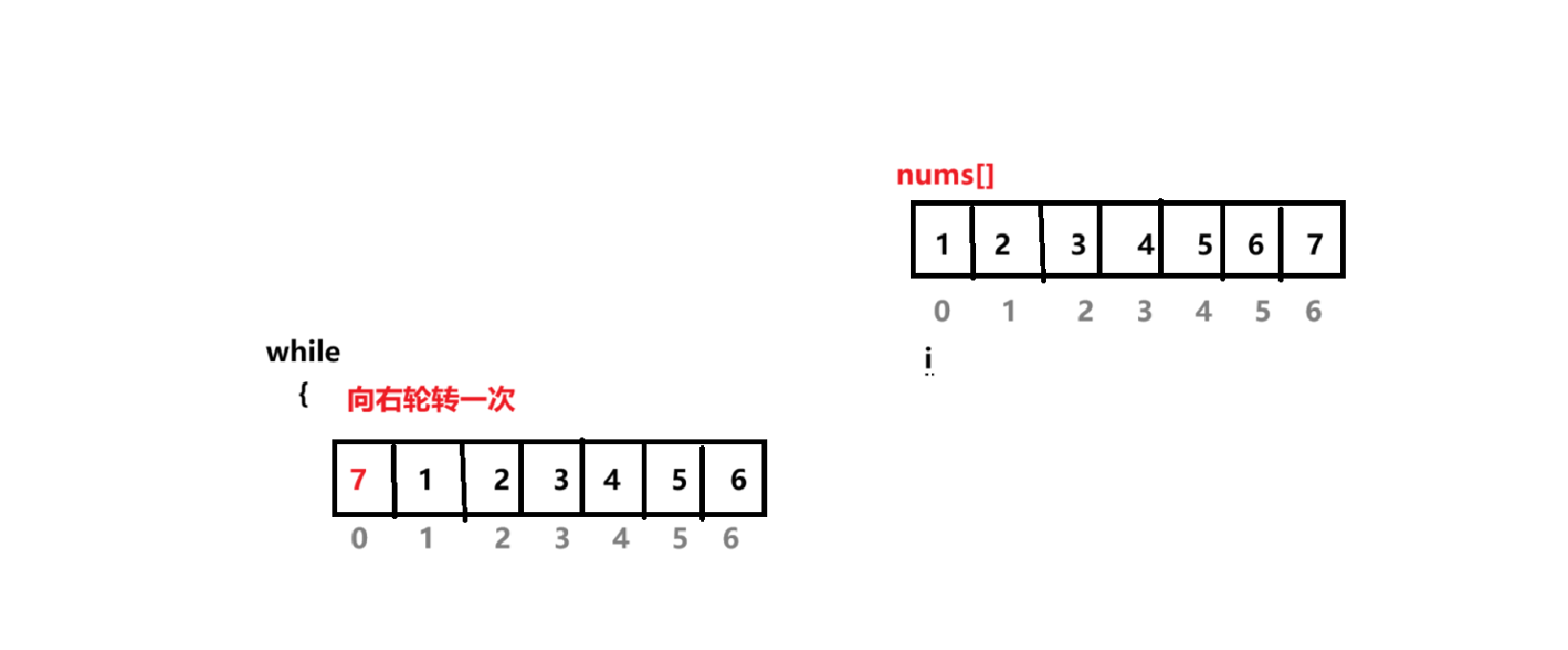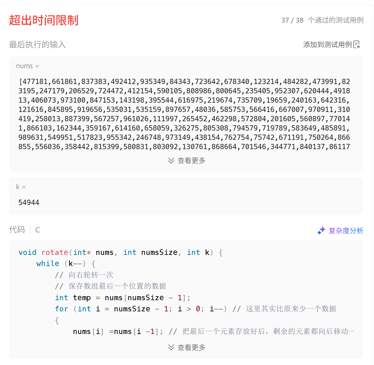 大致想法:循环k次,每次将数组所有元素向后移动一位(时间复杂度太高,超时,代码不通过)