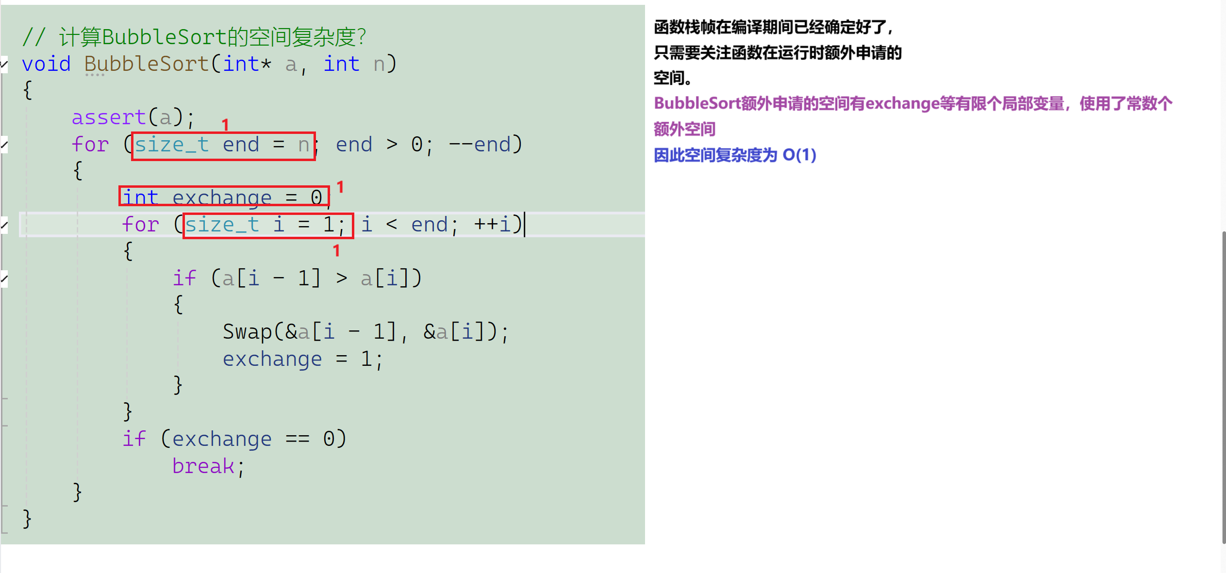 注意:函数运行时所需要的栈空间(存储参数、局部变量、⼀些寄存器信息等)在编译期间已经确定好了,因此空间复杂度主要通过函数在运行时候显式申请的额外空间来确定