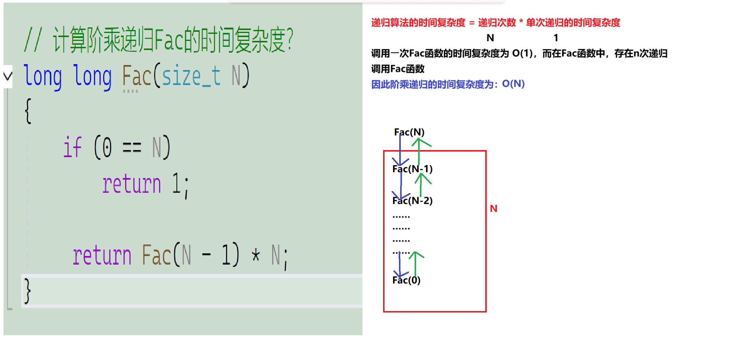 // 计算阶乘递归Fac的时间复杂度?--O(N)