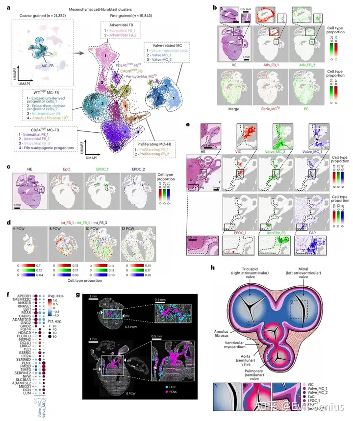 关键发现:Valve_MC_2细胞特异性高表达PENK,这是小鼠心脏中神经嵴来源间充质细胞的已知标志物。通过空间转录组证实,在人类发育早期的半月瓣和房室瓣中均存在强烈的PENK信号,为神经嵴细胞对人类心脏瓣膜的形成有重要贡献提供了直接证据,且这一贡献可能比此前认为的更为广泛。