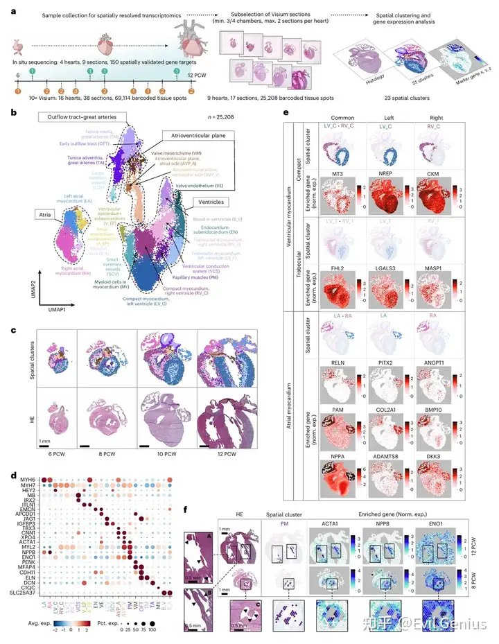 研究对孕6至12周的16例人类心脏样本进行了10x Genomics Visium空间转录组分析,并辅以对另外4例心脏中150个特定转录本的原位测序验证。