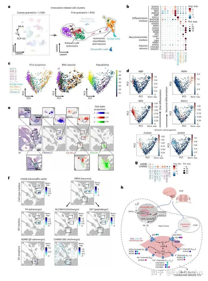 :窦房结和房室结细胞高表达起搏细胞核心转录因子(如SHOX2, TBX3)及轴导向分子(如TENM2),提示其为神经支配的关键靶点。