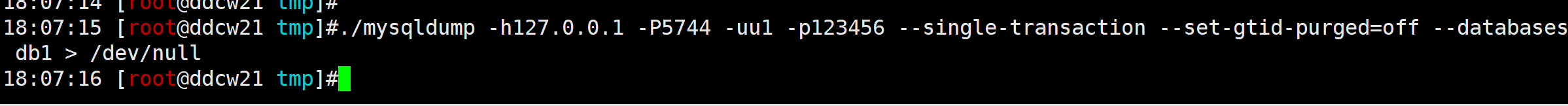 mysqldump -h127.0.0.1 -P5744 -uu1 -p123456 --single-transaction --set-gtid-purged=off --databases db1本案例所有命令和截图均为测试环境模拟的.