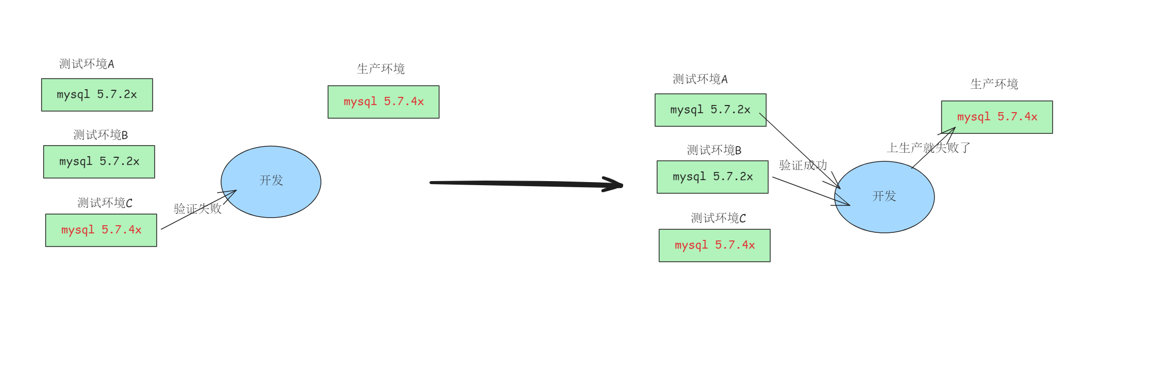 既然用户权限一致, 那最大的可能就算参数和版本问题了, 首先查看版本: 发现测试环境是5.7.2x,而生产是5.7.4x