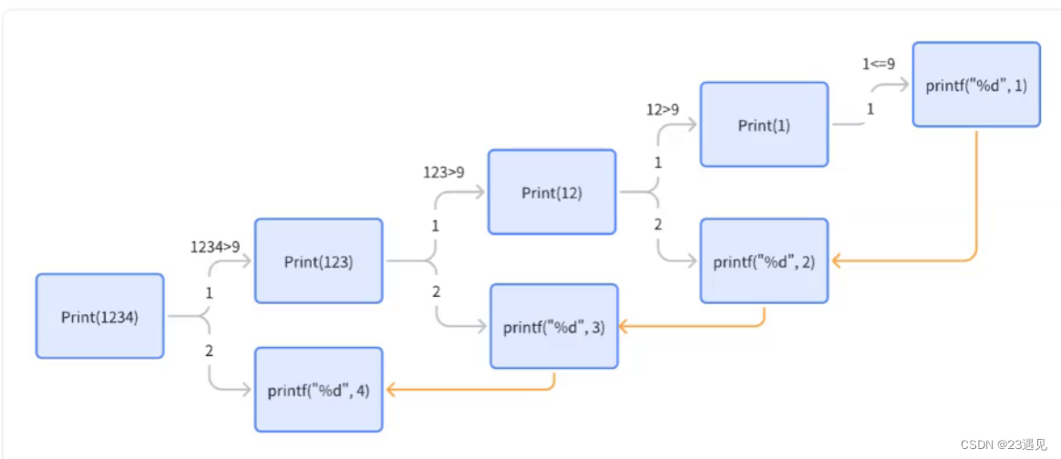 Print(1234)——>Print(123) +4 Print(12) +3 Print(1) +2 Print(1234)可以拆分为两步(其它类似): 1.Print(1234/10) //打印123的每一位 2.Print(1234%10) //打印4