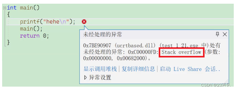 在C语言中每一次函数调用,都需要为本次函数调用在栈区申请一块内存空间来保存函数调用期间的各种局部变量的值,这块空间被称为运行时堆栈,或者函数栈帧。 函数不返回,函数对应的栈帧空间就⼀直占⽤,所以如果函数调⽤中存在递归调⽤的话,每⼀次递归函数调⽤都会开辟属于⾃⼰的栈帧空间,直到函数递归不再继续,开始回归,才逐层释放栈帧空间。 所以如果采⽤函数递归的⽅式完成代码,递归层次太深,就会浪费太多的栈帧空间,也可能引起栈溢出(stack overflow)的问题。