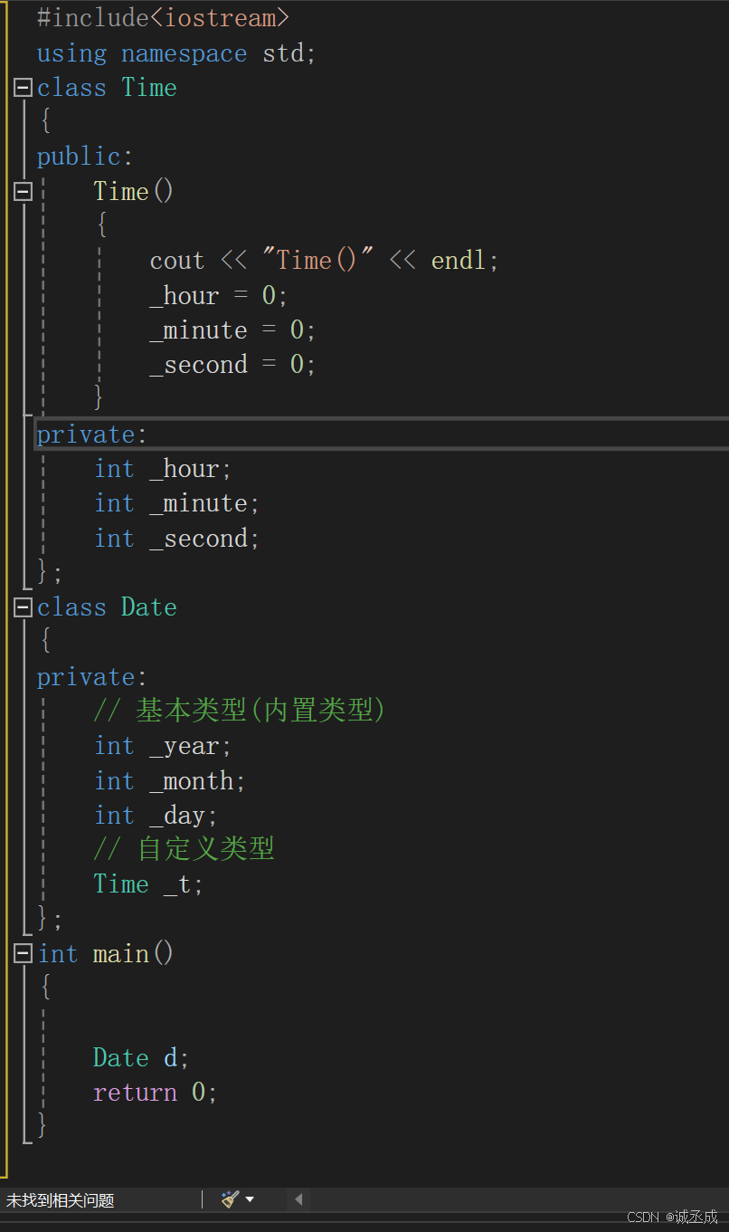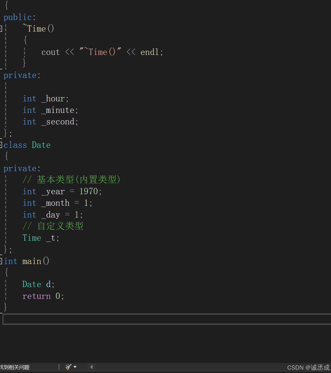 因为:main方法中创建了Date对象d,而d中包含4个成员变量,其中_year, _month, _day三个是 内置类型成员,销毁时不需要资源清理,最后系统直接将其内存回收即可;而_t是Time类对象,所 以在 d销毁时,要将其内部包含的Time类的_t对象销毁,所以要调用Time类的析构函数。但是:main函 数 中不能直接调用Time类的析构函数,实际要释放的是Date类对象,所以编译器会调用Date类的析构函数,而Date没有显式提供,则编译器会给Date类生成一个默认的析构函数,目的是在其内部调用 Time类的析构函数,即当Date对象销毁时,要保证其内部每个自定义对象都可以正确销毁 main函数中并没有直接调用Time类析构函数,而是显式调用编译器为Date类生成的默认析构函数 。