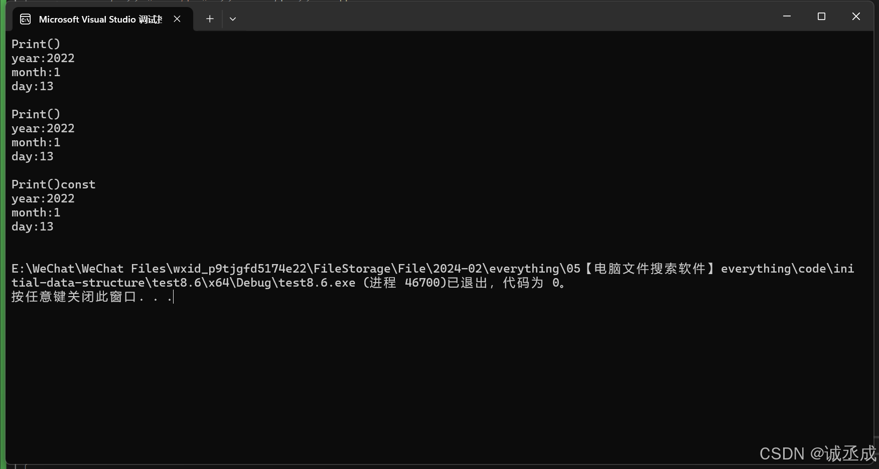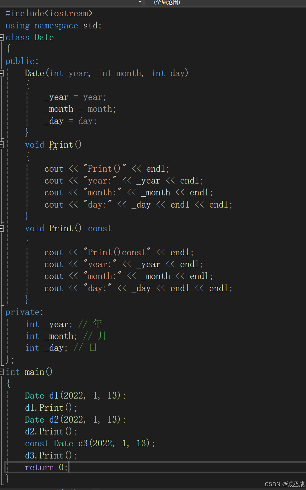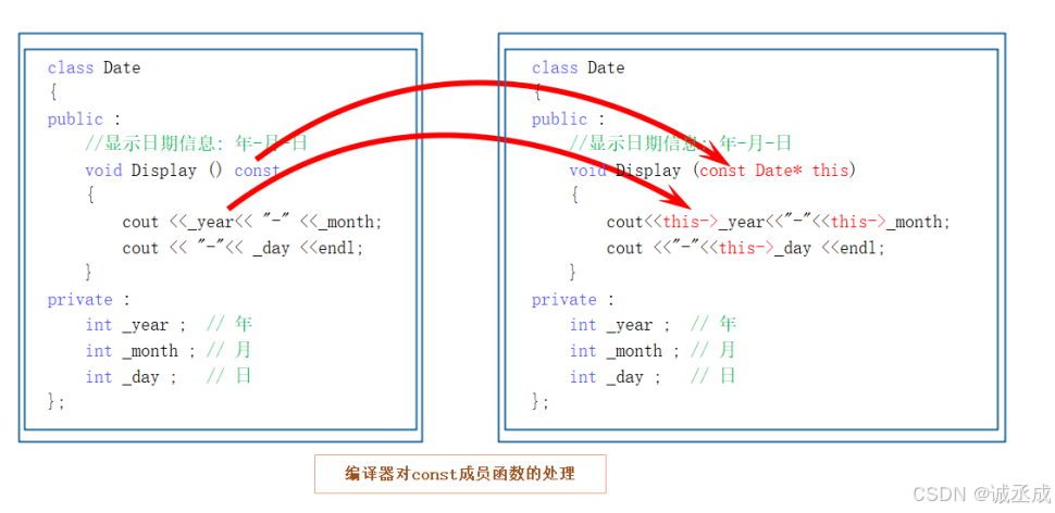 将const修饰的“成员函数”称之为const成员函数,const修饰类成员函数,实际修饰该成员函数隐含的this 指针,表明在该成员函数中不能对类的任何成员进行修改。