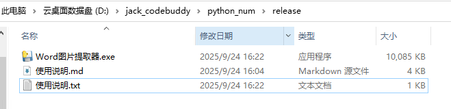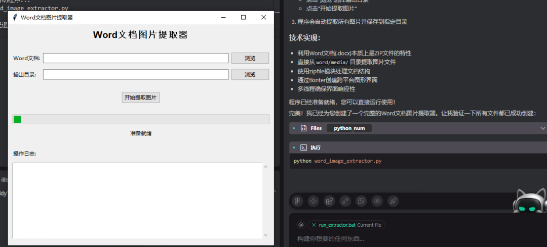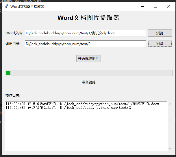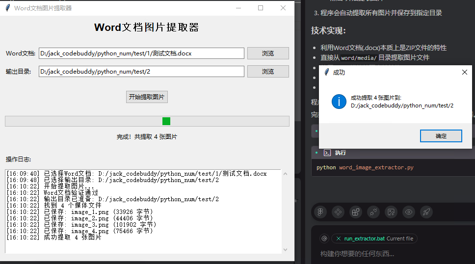 4.调试: 我们直接在这个打开的界面里进行功能测试。可以看到,程序成功的把word里所有的图片都提取在了我设定的文件夹内。