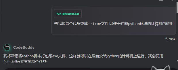 5.完善。 需要强调的是,当前的程序虽然满足了功能要求,但它需要在安装了python环境的电脑里运行。为了让这个程序能在任何一个计算机里使用,我们让AI将这个代码转换成EXE格式的文件,这样适用性就更高了。
