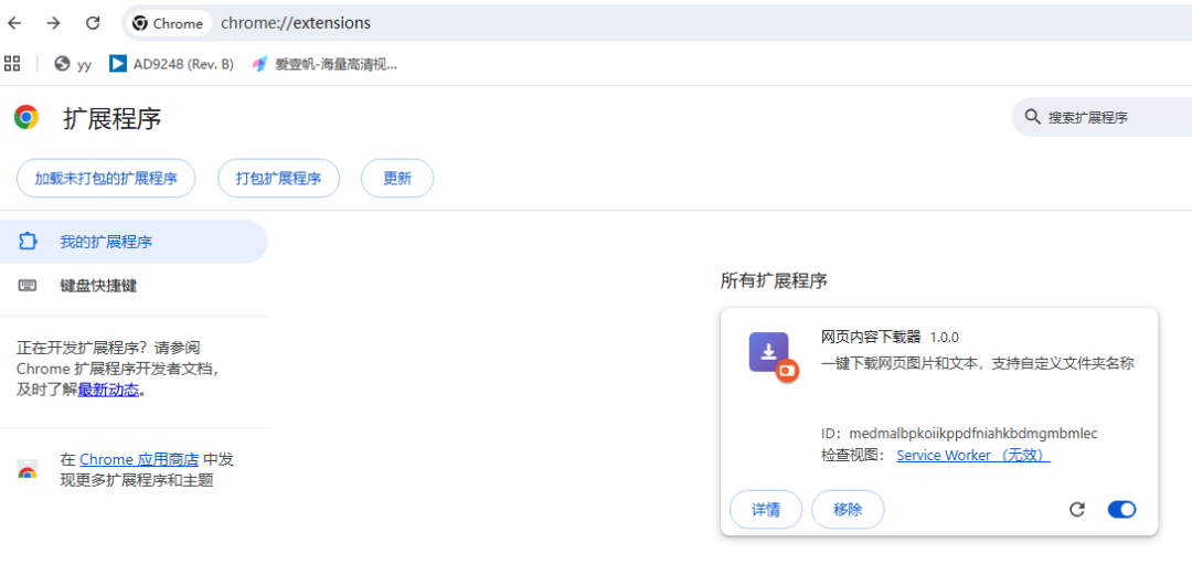 2.启用开发者模式:点击右上角的"开发者模式"开关
