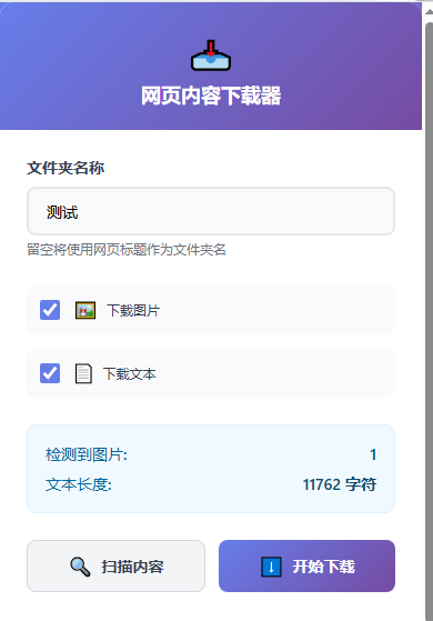 在弹出的界面上,点击‘扫描内容’按钮,最终就会显示出网页中的图片和文字数量,点击‘开始下载’即可在目标文件夹内看到所下载的内容。