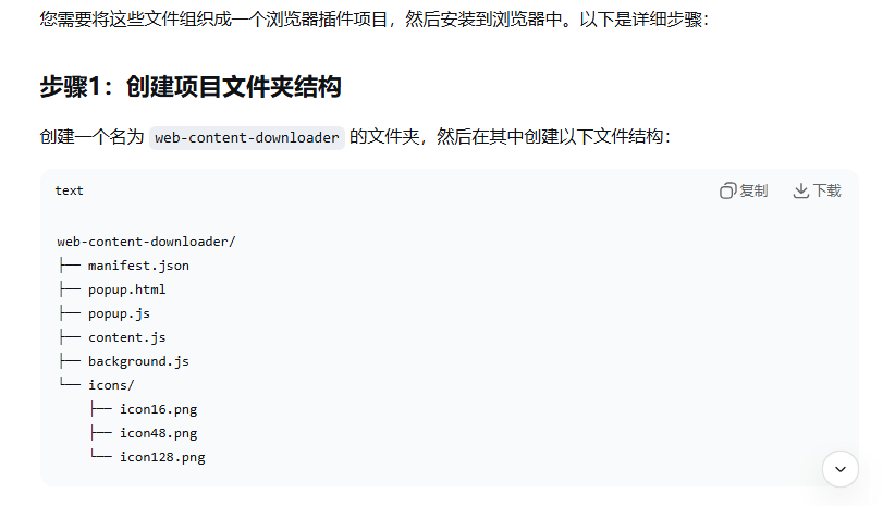 以“将网页里的图片和文字一键下载”这个功能为例。我的提示词如下: