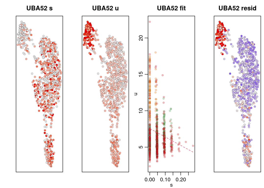 位于拟合线下方的点:u < 模型预测的值,可能表明这些细胞中基因转录正在减少。