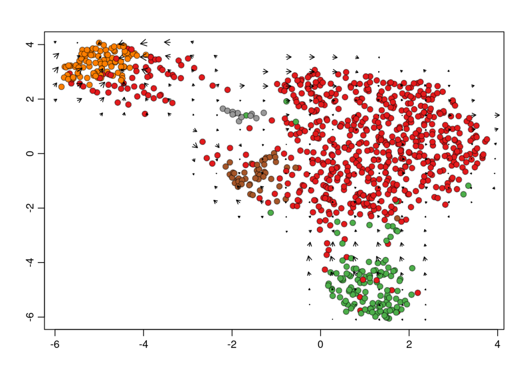 在UMAP图上展示整体的RNA速率场,箭头表示细胞状态转换的方向。