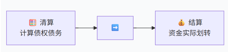 清算 | 结算前的准备过程 | 交易数据的交换、匹配、核对和轧差,计算最终债权债务净额 | 🧮 “算账”环节:计算谁该给谁多少钱 |