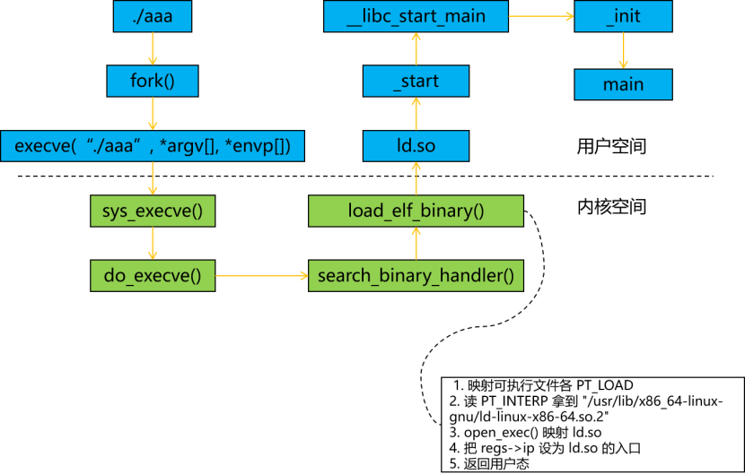 2.发现不是,就通过执行execve()函数调用驻留在内存中的加载器(loader)执行