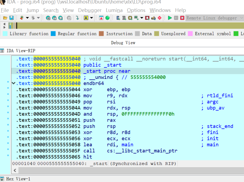 比如:本例中,Entry point address是0x1040,0x1040其实是相对于基地址的偏移(相对地址),加上基址(本例中是0x555555554000),那么程序的入口地址是0x555555555040,就是_start函数。