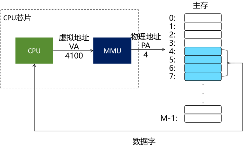 (2)CPU内的MMU(内存管理单元)利用存放在主存中的、由OS管理的查询表(页表)来将虚拟地址动态翻译成物理地址。