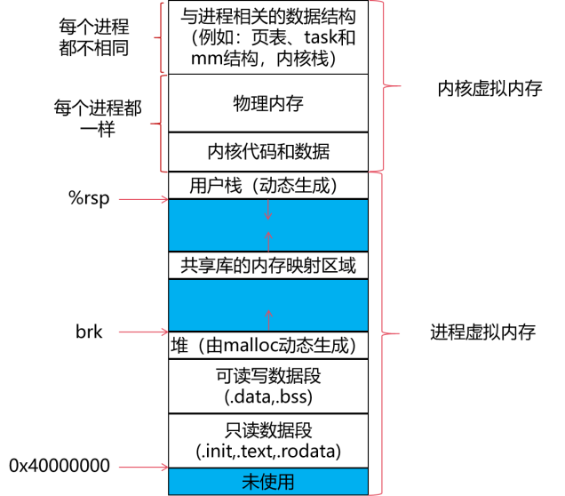 Linux为每个进程维护了一个如下图所示的虚拟地址空间。