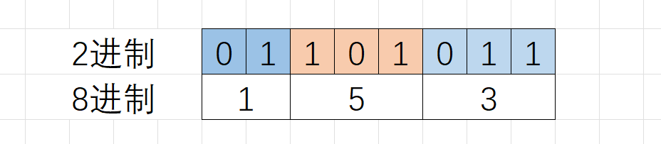 8进制的数字每一位是0~7的数字,各自写成2进制,最多有3个2进制位就足够了。2进制转8进制数的时候,从2进制序列中右边低位开始向左每3个2进制位会换算一个8进制位,剩余不够3个2进制位的直接换算。