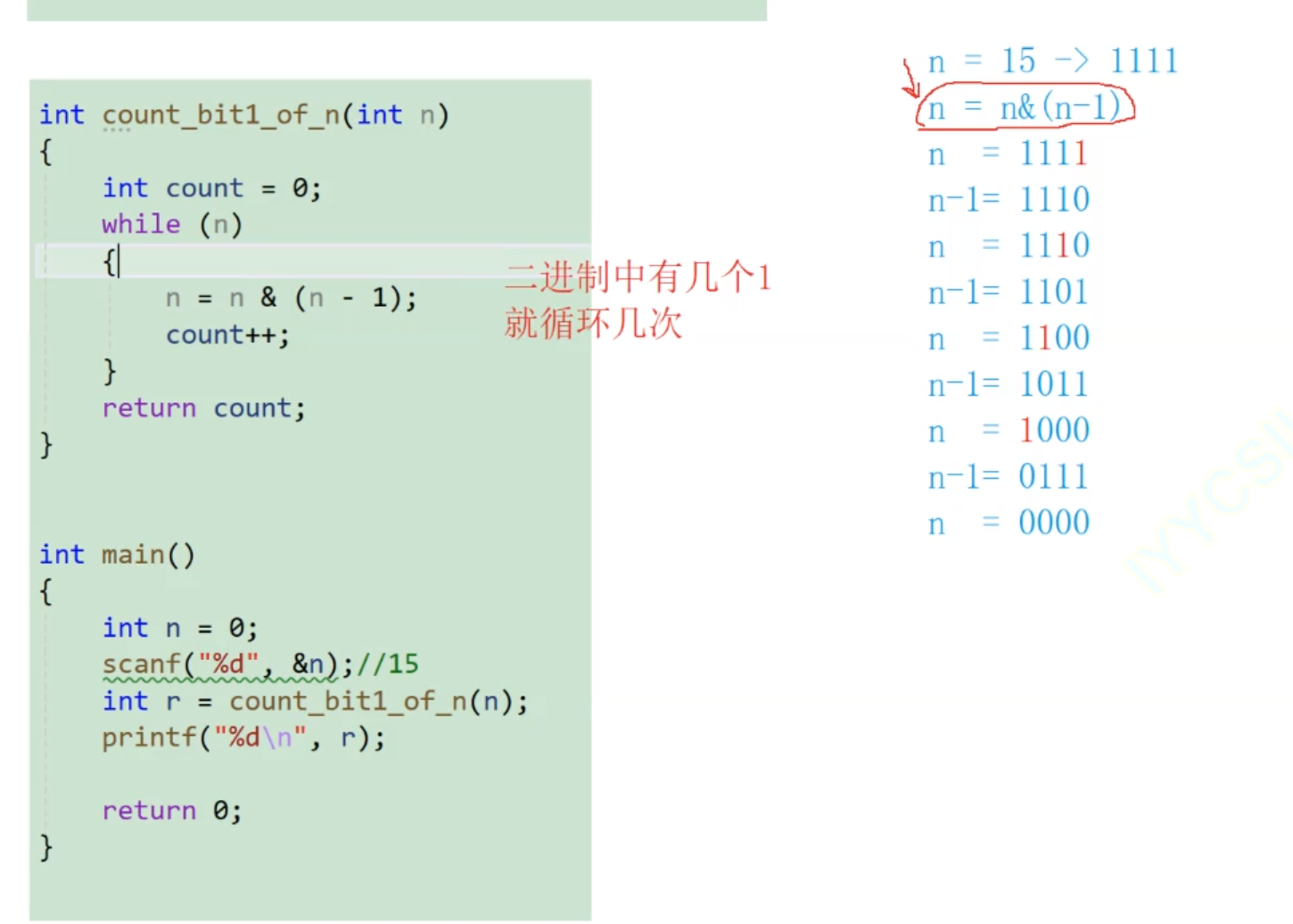 这种方式是不是很好?比上一个代码更加高效,上一个代码无论1有也罢没有也罢,都要循环32次,而这个代码几个1就循环几次。代码达到了优化的效果,但是很难想到。
