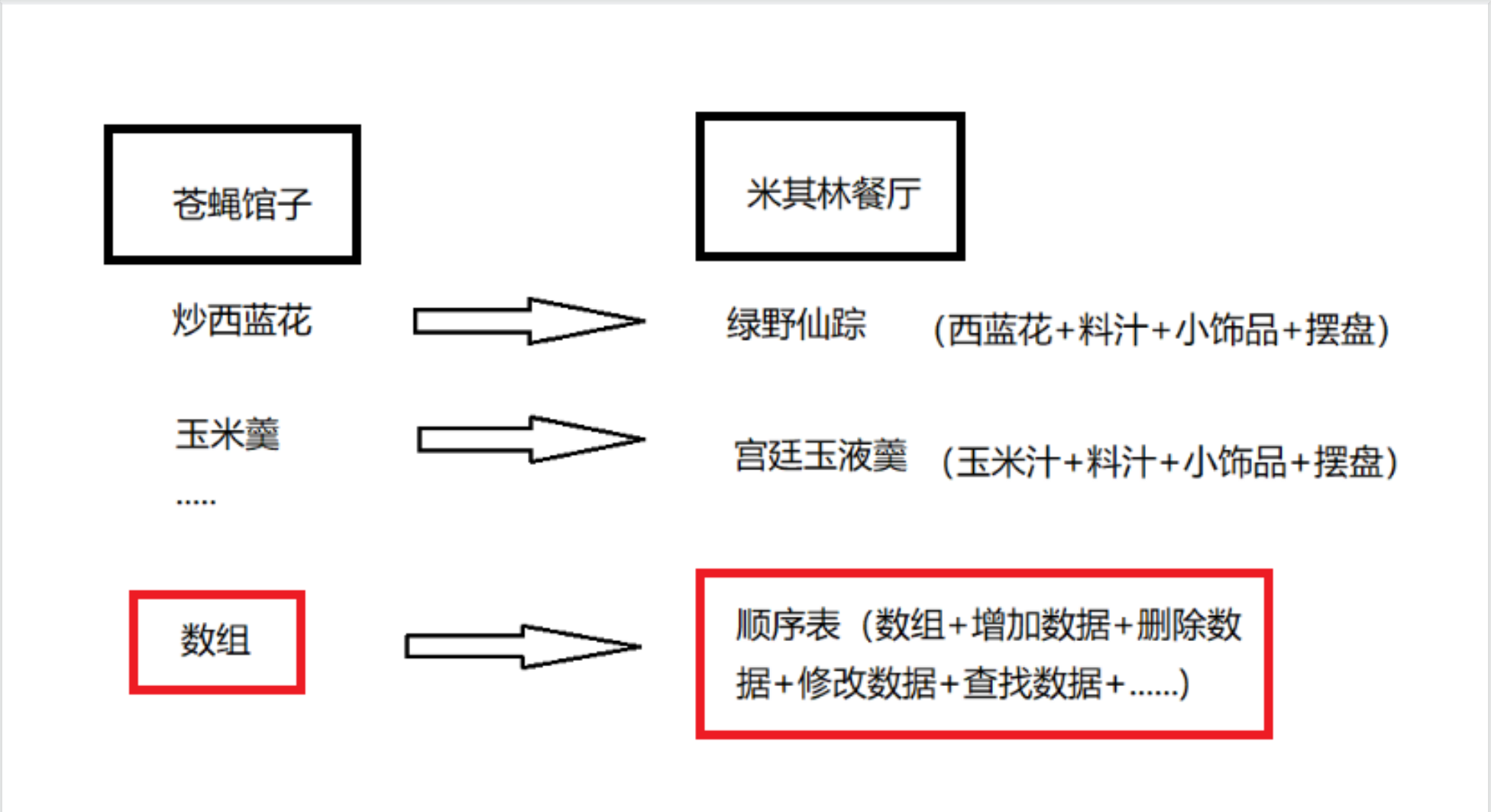 举个例子,数组和顺序表的关系可以拿苍蝇小馆和米其林五星级餐厅类比一下——