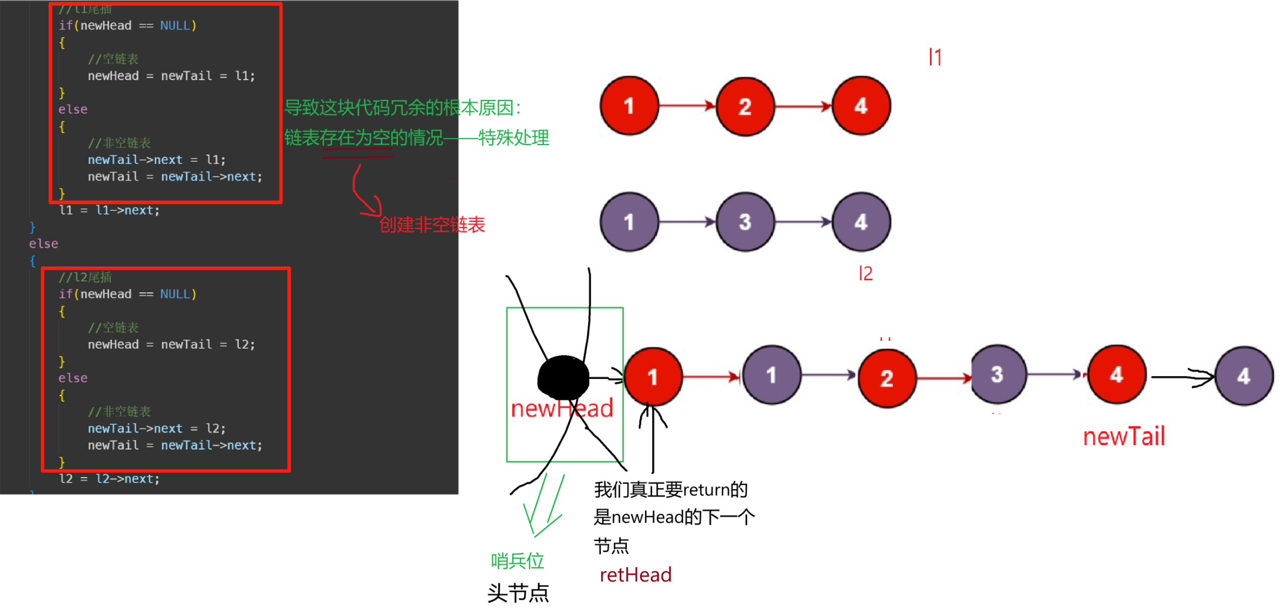 再强调一遍,如果省略前面的判断l1、l2表空,这里不建议删,这里删了,别的地方要加东西了。