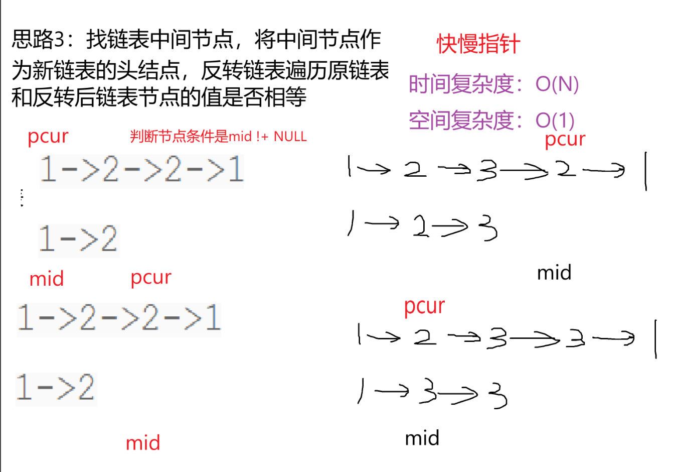 我们改进的思路是:找链表中间节点,将中间节点作为新链表的头节点,反转链表,遍历原链表,看看和反转1后的链表头节点的值是否相等。