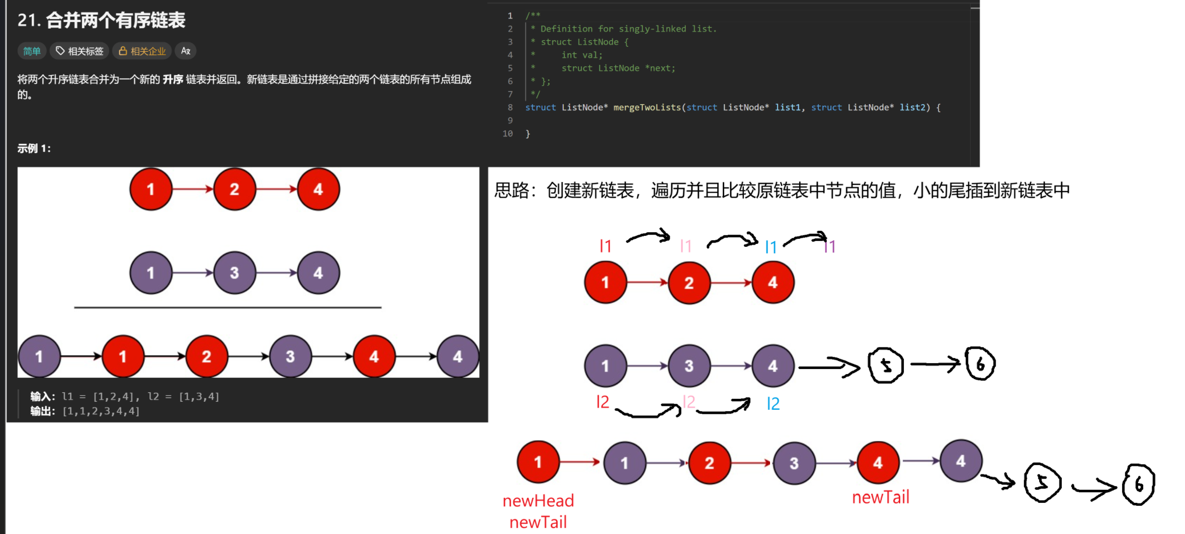 博主题解链接:创建新链表、尾插解决合并两个有序链表问题