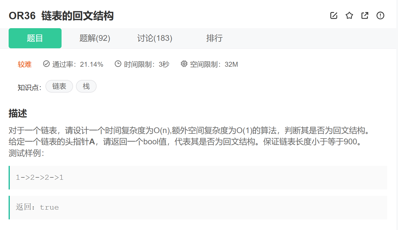 我们的思路是:创建新链表,保存原链表中的所有节点,反转新链表,比较新旧链表中所有节点的值是否相同——