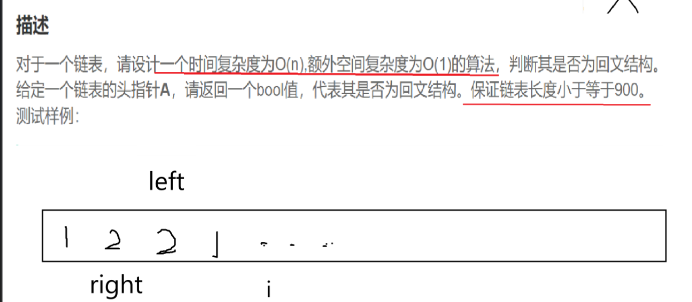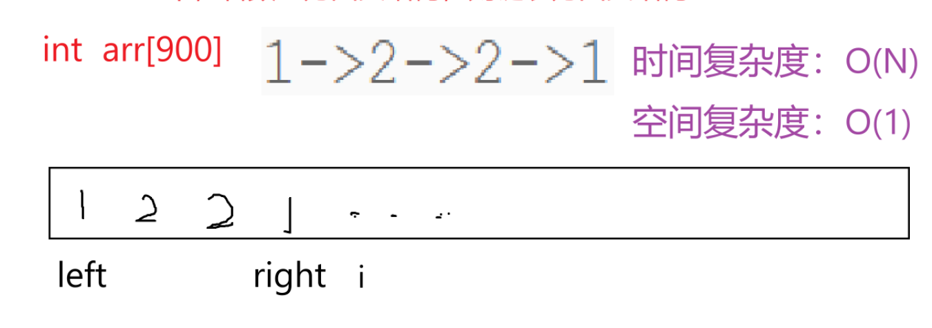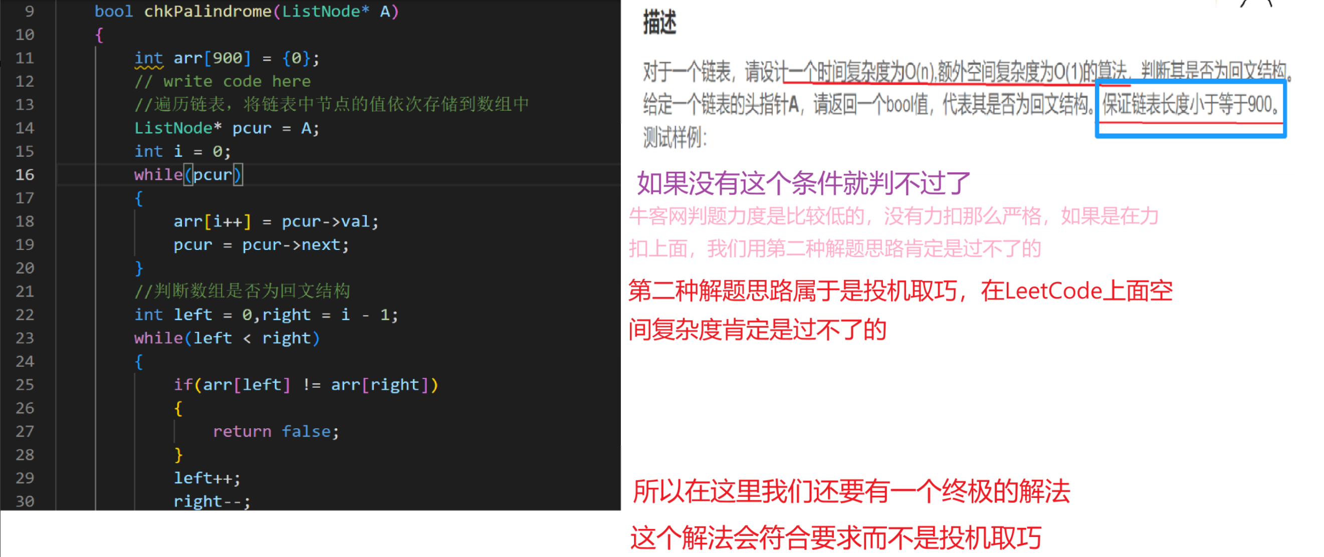 思路2:我们创建大小为900的数组,遍历链表将节点的值依次存储在数组中,若数组为回文结构,则链表就是回文结构。