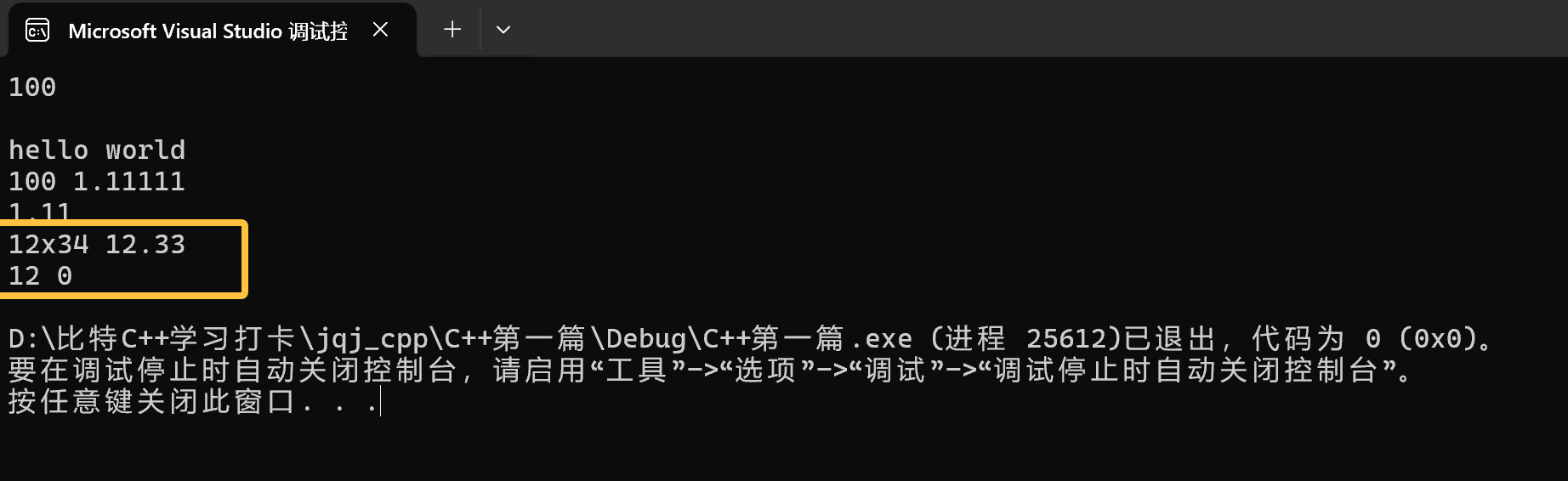 注意:C++兼容C语言绝大多数的语法,所以C语言实现的hello world依旧可以运行,C++中需要把定义文件代码后缀改为.cpp,vs编译器看到是.cpp就会调用C++编译器编译,linux下要用g++编译,不再是gcc。