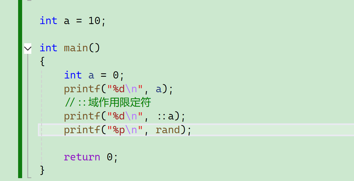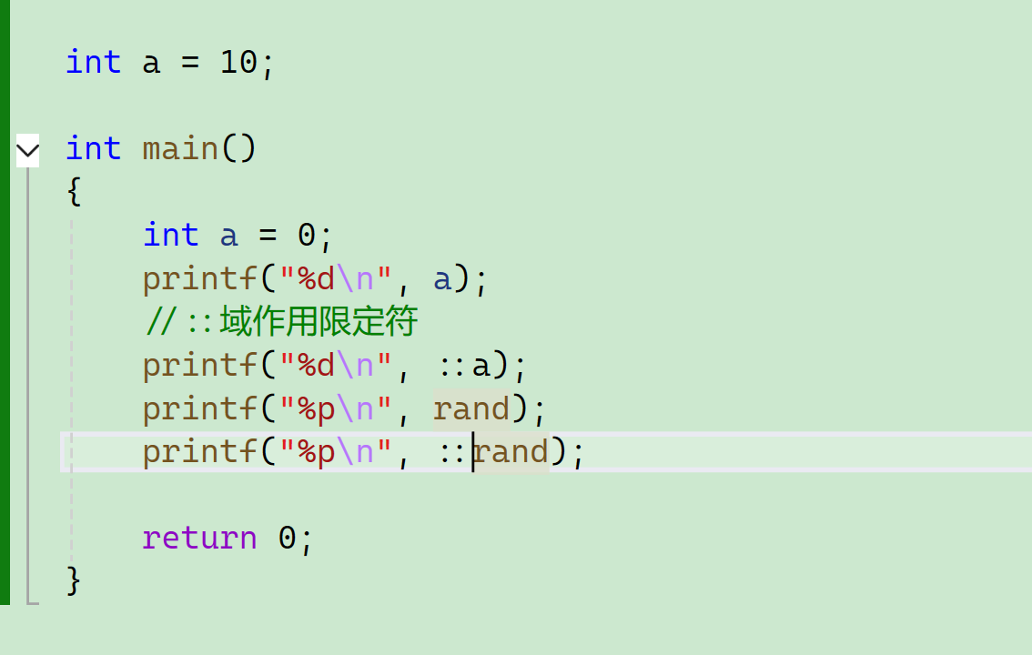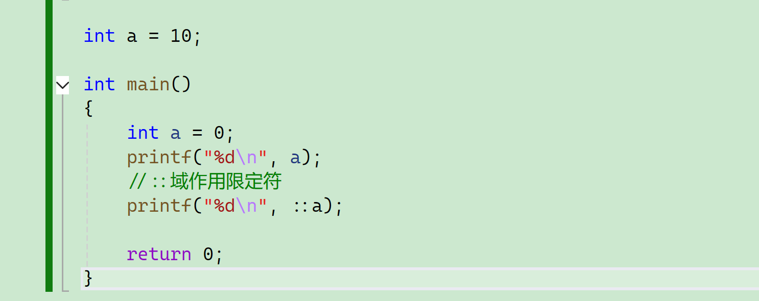 如果我们要访问全局的a怎么做呢?这时候就要用到域作用限定符:: 。
