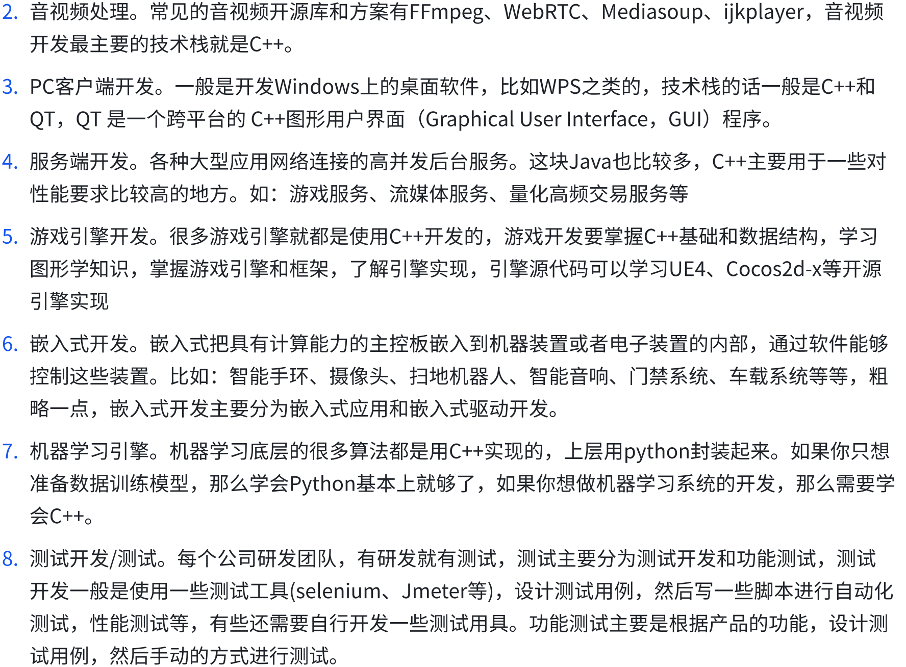 C++的应用领域服务器端、游戏(引擎)、机器学习引擎、音视频处理、嵌入式软件、电信设备、金融应用、基础库、操作系统、编译器、基础架构、基础工具、硬件交互等很多方面都有。比如下面这些: