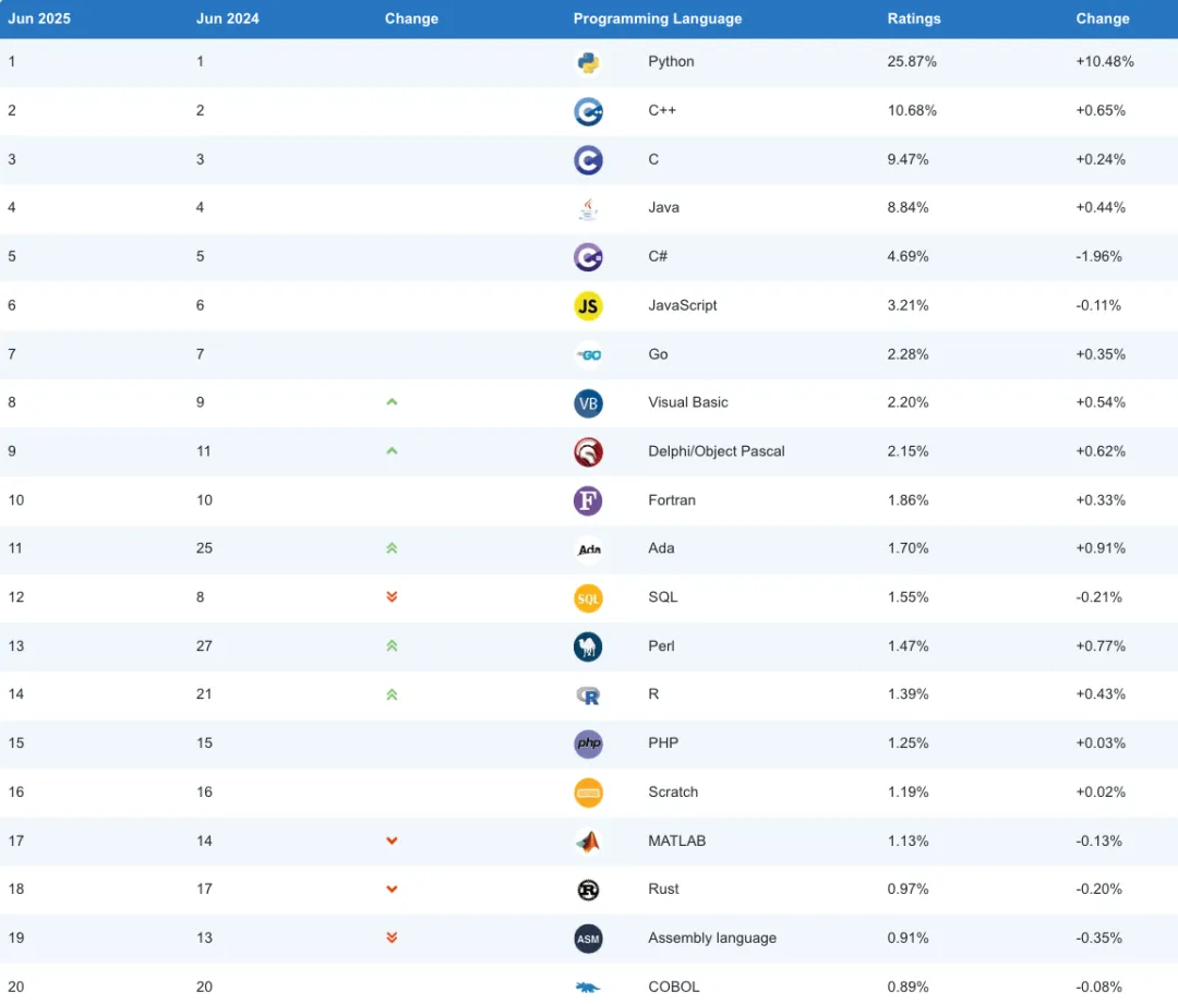 这是今年6月TIOBE发布的编程语言排行榜:
