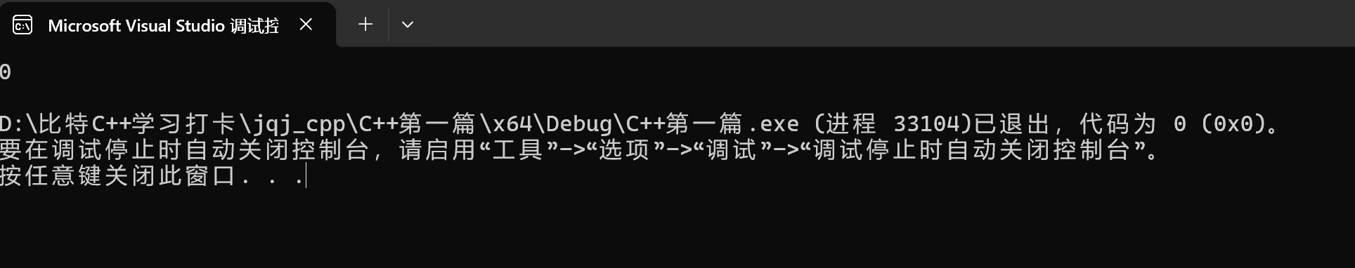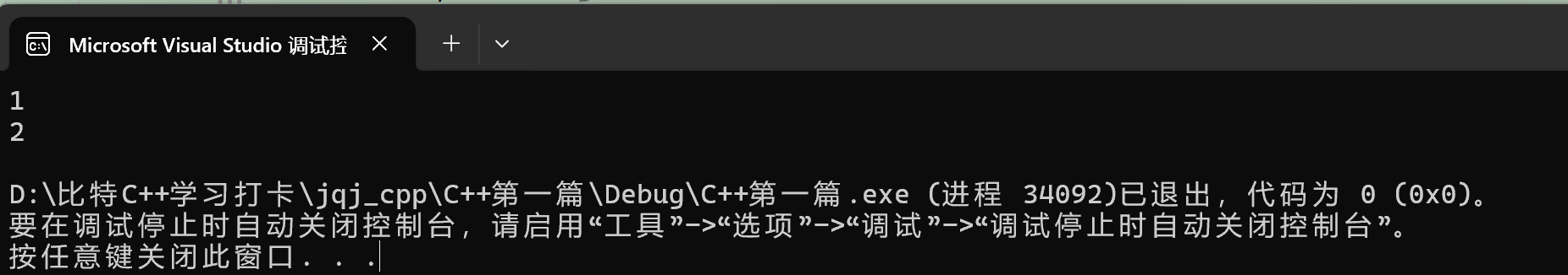 C++我们还是用VS来编译,VS是按后缀识别文件的,我们创建文件时只需要从原来的.c变回默认的.cpp就可以了,可能需要适应一段时间。 现在C++还是在VS这样的IDE(集成开发环境)的界面,等到我们学到Linux(指令去编译)的时候就是在一个终端,或者说控制台——一个黑框框——里面去书写指令了——
