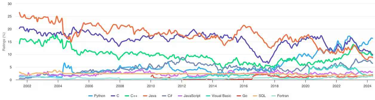 C++虽然变化不大,但随着AI的爆火,Python在一年内涨幅就超过了10%,因为AI的上层很多都是用Python写的,简直可以说是暴发户了。 Python是门解释性的语言,它没有编译的过程,只能在运行时报错,所以很慢。C++是指令性的,因而胜在性能。