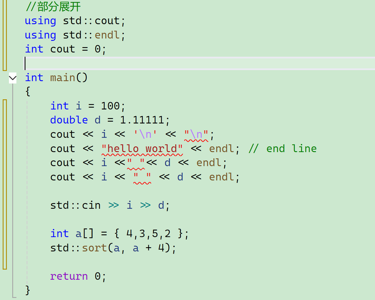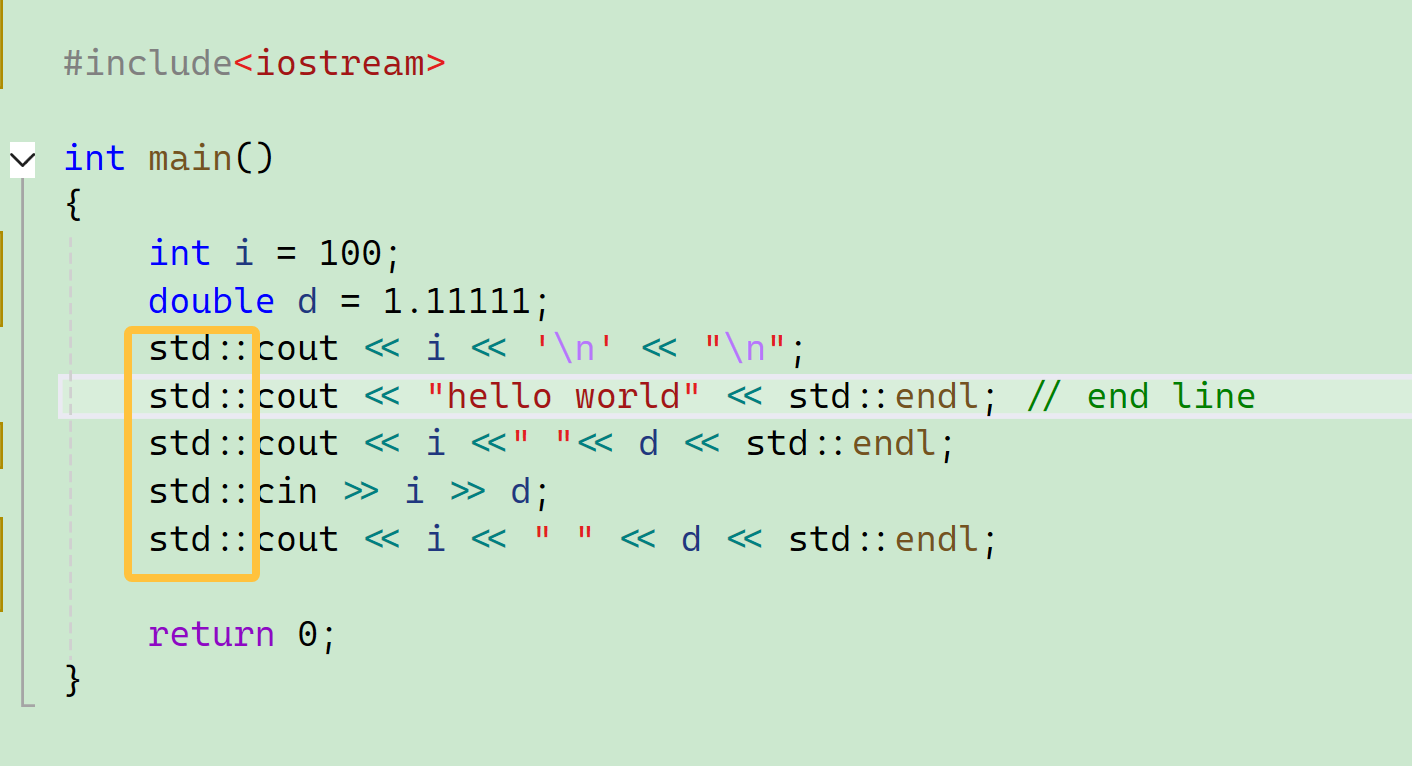 这里的几个新面孔像“<<” “cout”“endl”我们一会儿也会和其它新面孔一块儿介绍。