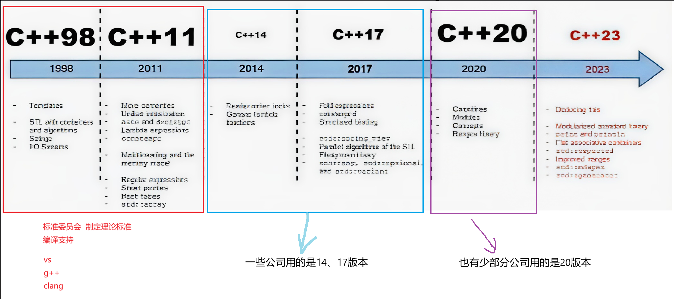 我们学的时候C++98、C+11这两个就够用了: