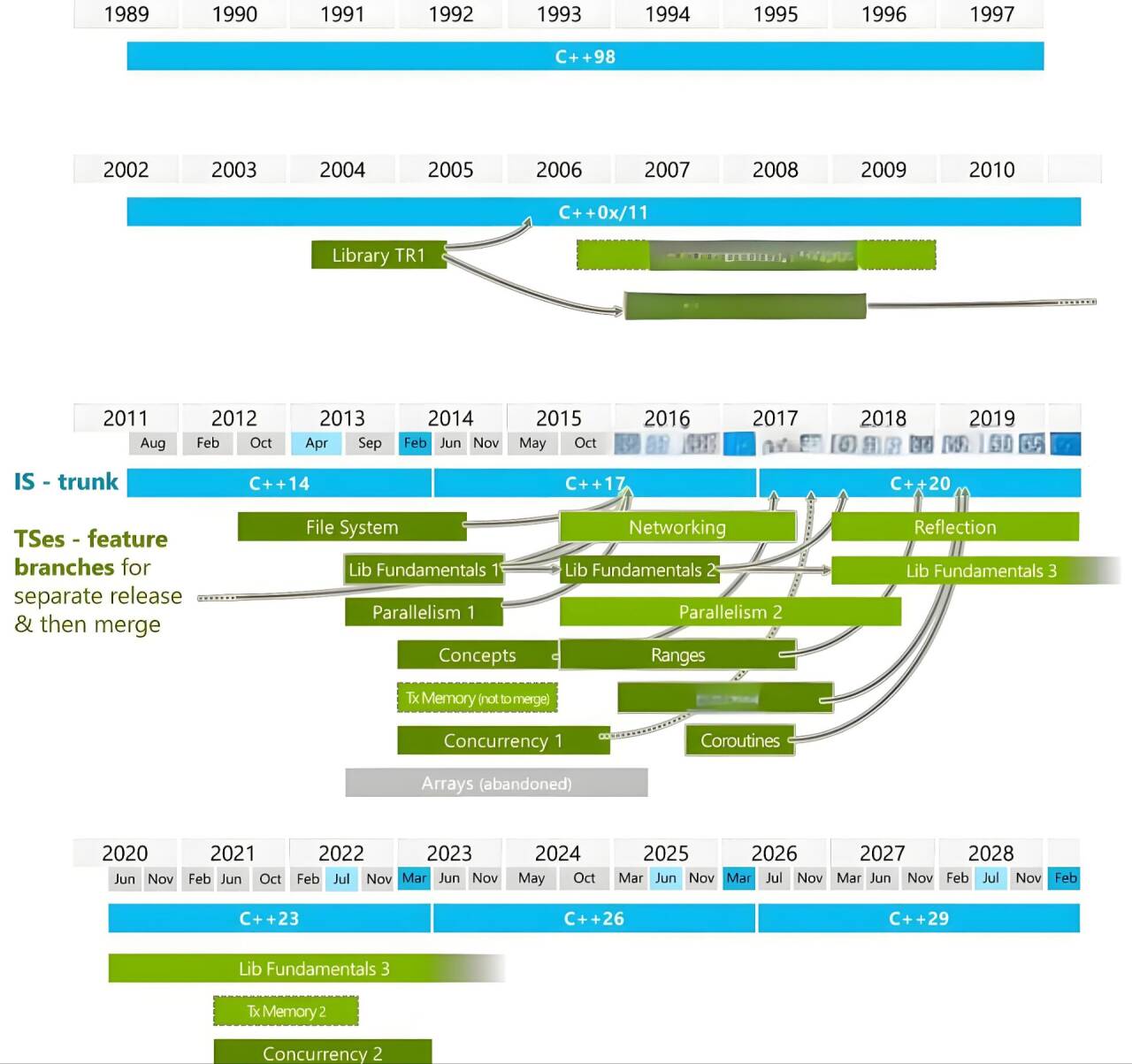 下面几张图就是C++的几个版本啦,就像有些友友可能玩过二游,有3.0版本、几点几版本,一样的道理。中间其实C++的委员会还有一个从“五年计划” 到“三年计划”这样的有趣的小插曲,大家感兴趣可以去了解了解。
