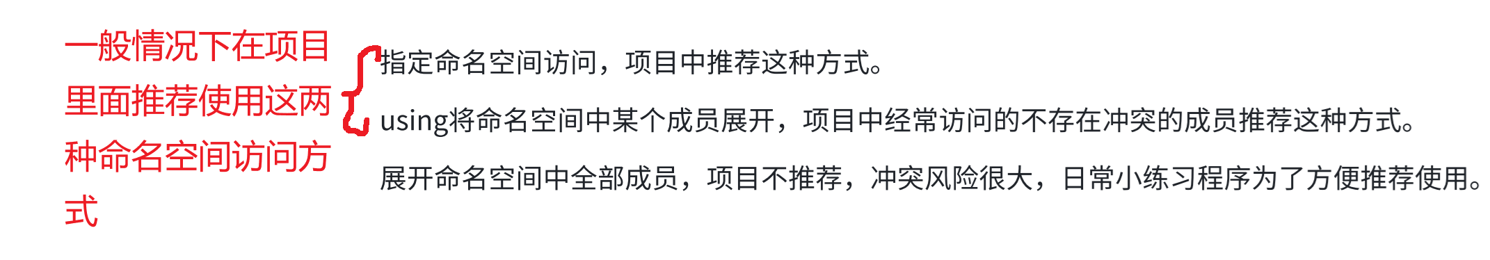 这样是把命名空间里面的东西暴露到全局去了,虽然它叫“展开命名空间”,但是这个展开的意思其实就是把标准库里面的比如说头文件(这个<iostream>就是拿namespace std包起来的),也就是说,这句话的意思就相当于暴露到全局了: