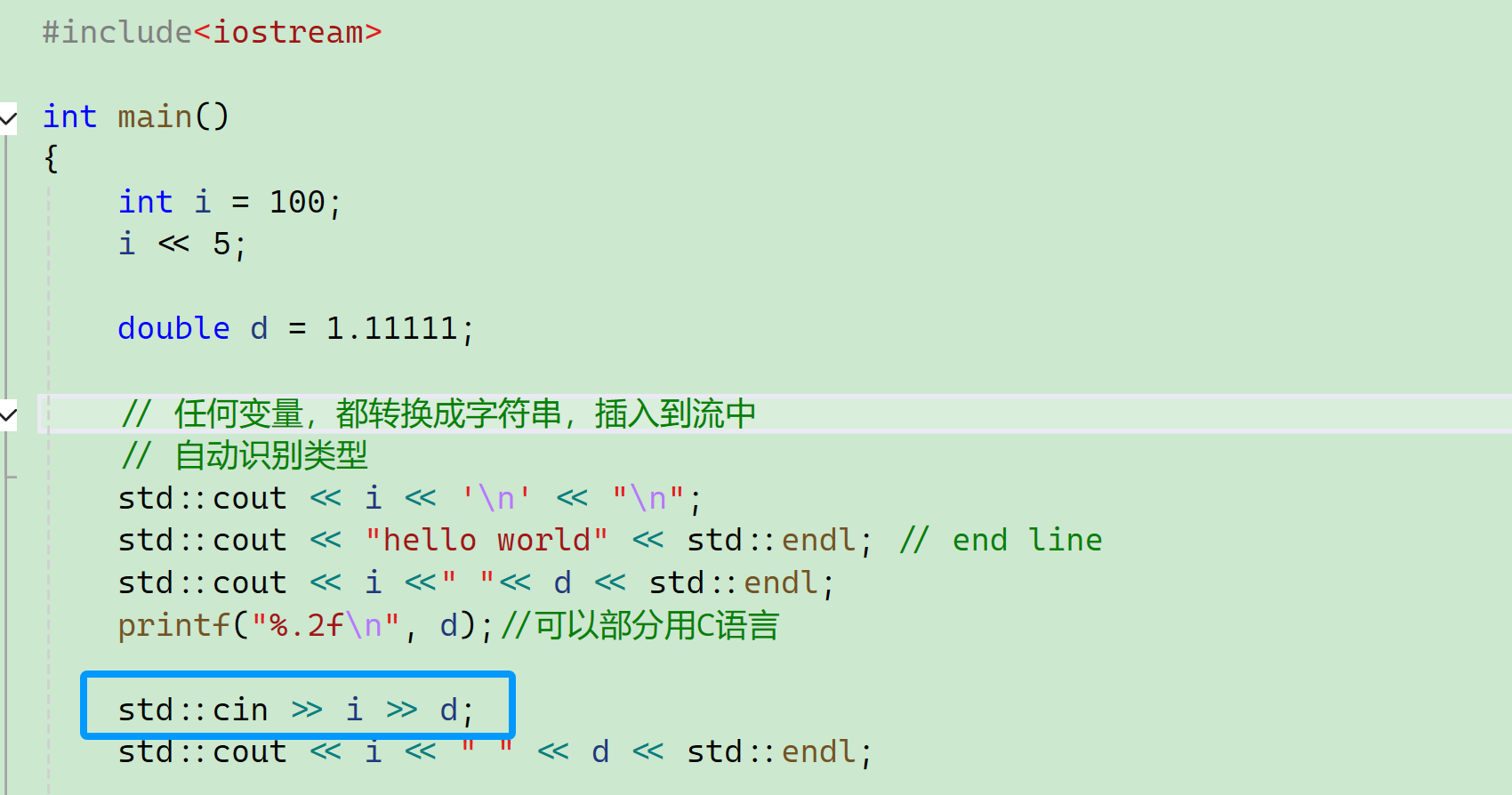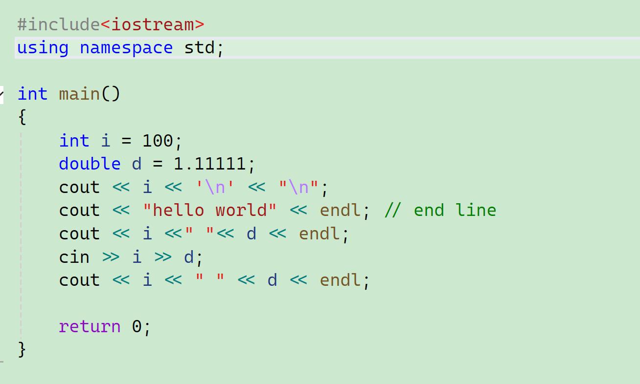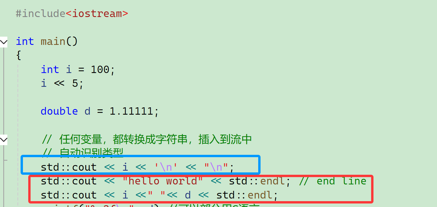 C++有一套自己的输入输出,严格来讲C++版本的"hello world"应该是这样写的: