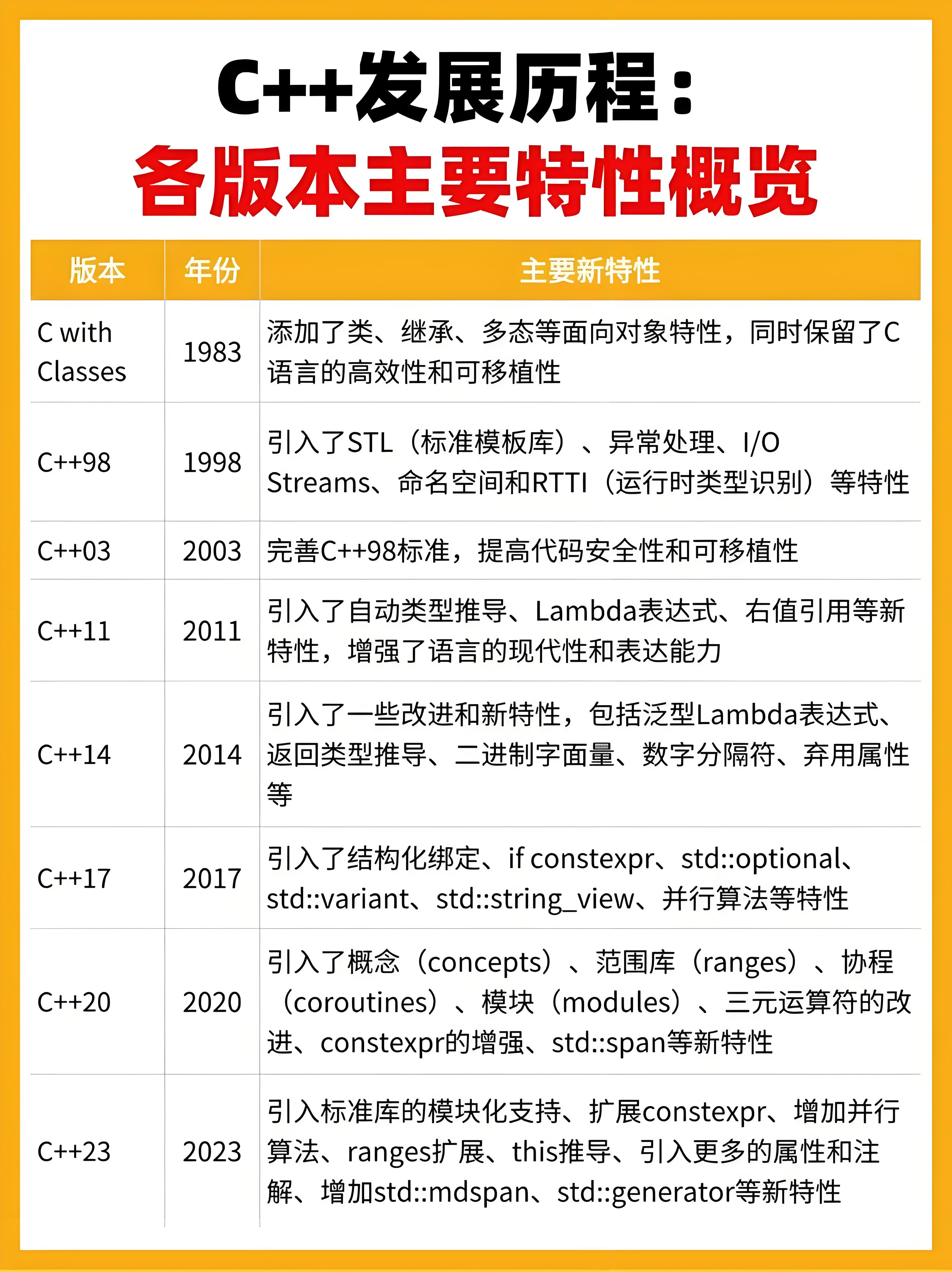 如下图就是C++发展历程,包含了各个版本主要的特性: