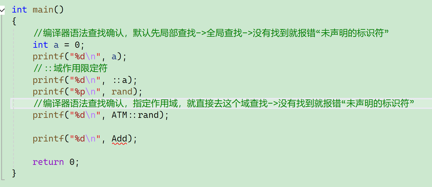 注意: 域作用操作符::前面要加上命名空间的名字,否则就默认是全局,默认不会到命名空间搜索。 找不到就是未声明的标识符。